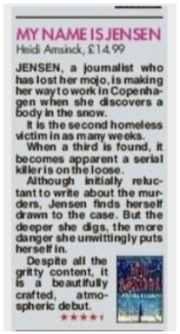 Review from The Sun. ‘JENSEN, a journalist who has lost her mojo, is making her way to work in Copenhagen when she discovers a body in the snow. It is the second homeless victim in as many weeks. When a third is found, it becomes apparent a serial killer is on the loose. Although initially reluctant to write about the murders, Jensen finds herself drawn to the case. But the deeper she digs, the more danger she unwittingly puts herself in. Despite all the gritty content, it is a beautifully crafted, atmospheric debut. 4/5’